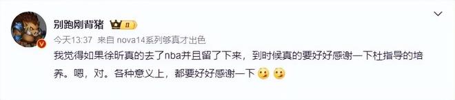 对于徐昕收到NBA球队试训的消息,媒体人“别跑刚背猪”表示,如果徐昕真的能够留在NBA的话,“到时候真的要好好感谢一下杜指导的培养。嗯,对。各种意义上,都要好好感谢一下!”至于这位媒体人要表达什么意思,球迷们需要好好体会。