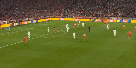 于是在第85分钟,巴尔韦德回不去了,向来体能很好的路易斯-迪亚斯直面阿诺德,便从侧面帮助拜仁打出了下半场难得的好机会: