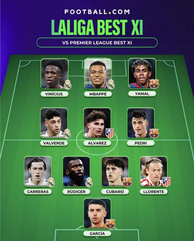 西甲的优势则是在比赛拉快节奏后的杀伤力。姆巴佩和亚马尔都是2亿欧元级别,佩德里和维尼修斯1.5亿欧元,巴尔韦德1.2亿欧元。这种天赋层级一旦让比赛进入攻防转换,西甲的个人能力能连续把防线打穿。单看这套前中场组合,一旦状态对上,其爆发出来的上限确实压过了英超。