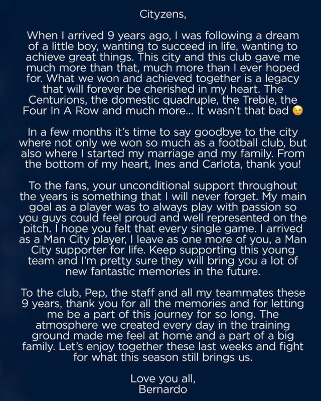 曼城官方宣布B席今夏离队,葡萄牙球星也发布告别信,表达对曼城球迷的热爱(节选):