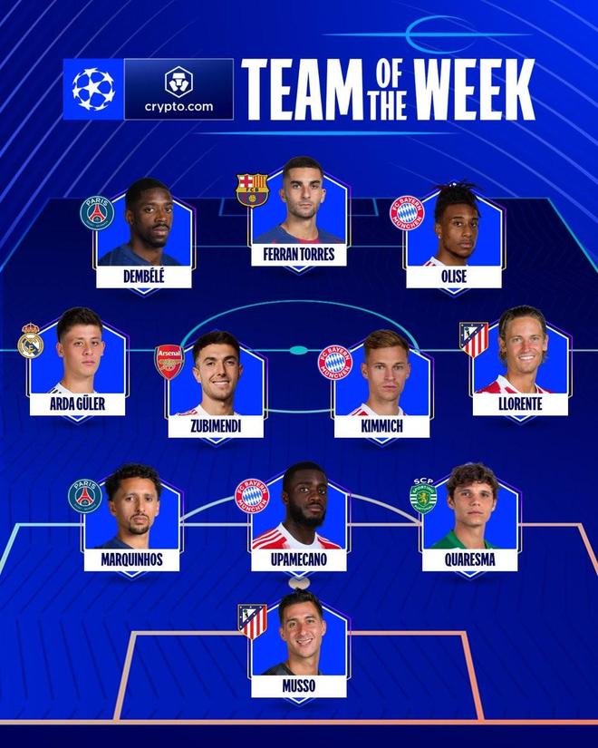 欧冠官方公布了本周最佳阵容,登贝莱、奥利塞、费兰-托雷斯领衔。