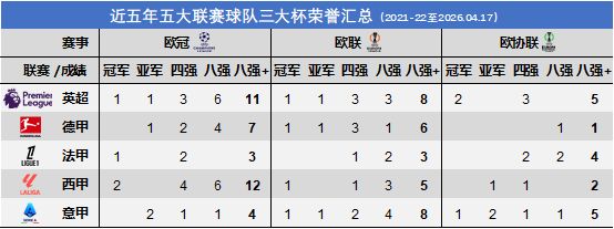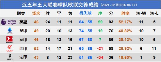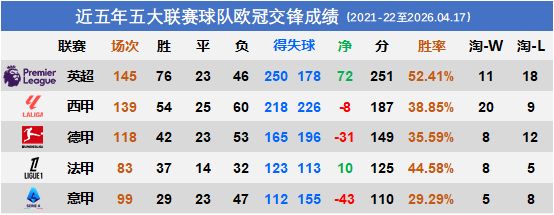 对英超胜负处于劣势,但淘汰赛暂时领先;对西甲胜负持平,但淘汰赛一败涂地;对德甲、法甲占据明显优势。
