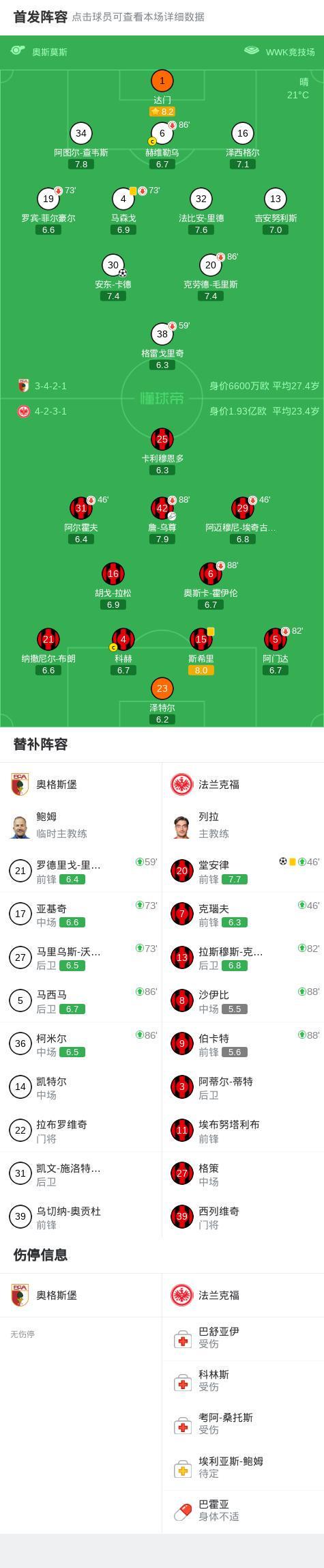 奥格斯堡1-1法兰克福,安东-卡德首开记录,堂安律扳平